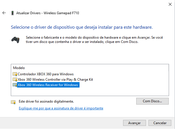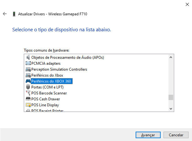 Selecione a opção “Xbox 360 Wireless Receiver for Windows” e clique em “Avançar”